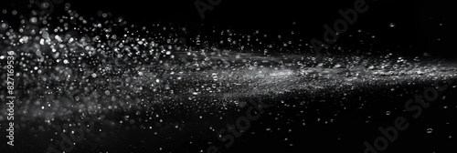 Water spray on black background, white water droplets falling in the air, particles of dust floating in space.Abstract black and white bokeh lights with sparkling particles creating a dramatic