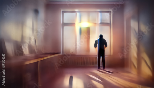 Watercolor abstract blurry drawing. Man makes repairs in new apartment in sun room. Generative AI