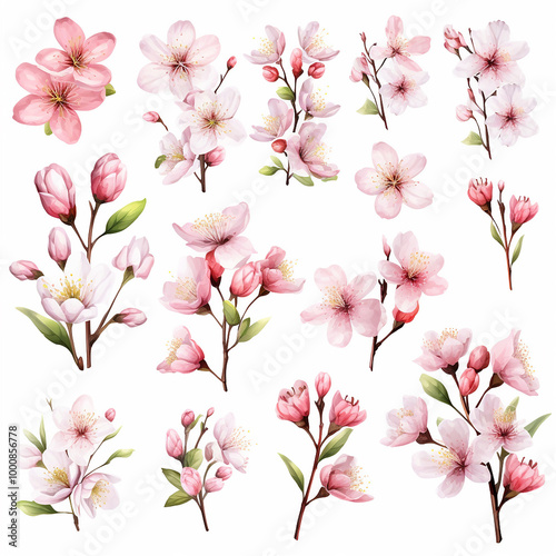 Watercolor Blossom Clipart Set on White Background