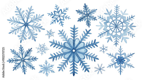 Watercolor Blue Snowflake Collection 12 Unique Designs, Isolated on White Background, Winter, Holiday, Christmas Snowflake, Watercolor, Winter, Holiday