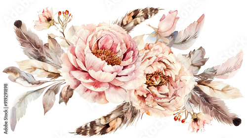 Watercolor boho peonies and feathers in loose and freeform style, soft pinks and whites, white background