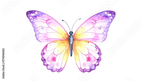 butterfly, watercolor, illustration, wing, pink, purple, yellow, delicate, artistic, vibrant, pretty, pastel, spring, summer, nature, insect, beautiful, colourful, flower, design, detail, pattern, flying, soft