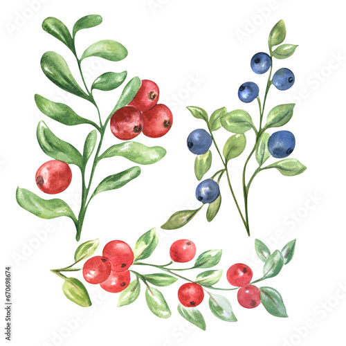 Watercolor composition of lingonberries and blueberries on a white background. Self made. Can be used in design, labels, cards, advertising brochures, children's books.