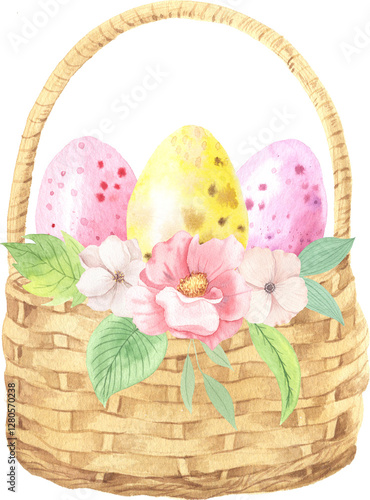 symbol, spring, basket, composition, egg, decoration, colours, easter, art, celebration, holiday, design, illustration, happy, traditional, gift, beautiful, isolated, background, greeting, season, nature, element, image, watercolor, white, decorative, paint, seasonal, april, event, graphic, drawn, cartoon, elegant, decor