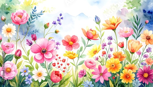 watercolor, floral, meadow, flower, landscape, spring, summer, colourful, vibrant, lush, blooming, wildflower, garden, plant, nature, high-coloured, pastel, delicate, detailed, background, mountain, sky, gentle, soft, artistic, impressionistic, botanical, illustration, pink, red, orange, yellow, purple, blue, green, white, bloom, springtime, beautiful, art, design
