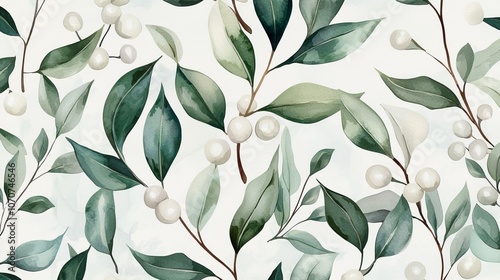 watercolor, floral, pattern, white, berry, green, leaf, botanical, nature, illustration, design, art, background, texture, seamless, repeat, wallpaper, fabric, textile, wrapping paper, printable, digital artwork, graphic, design element, vintage, romantic, elegant, delicate, feminine, minimalist, modern, trendy, spring, summer, autumn, winter, wedding, celebration, holiday, invitation, card, stationery, gift, project, decoration, graphic design, creative