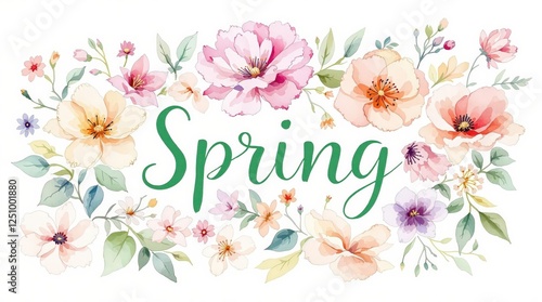 Watercolor flowers and word spring