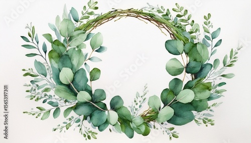 watercolor hanging wreath of eucalyptus greenery leaves white background
