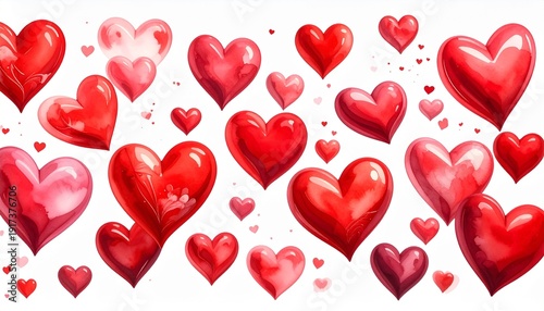 Watercolor hearts on white background for valentine's day celebrations and romantic themes.