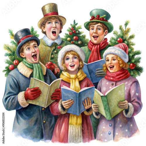 Watercolor holiday element, holiday carolers, singing joyfully, transparent background