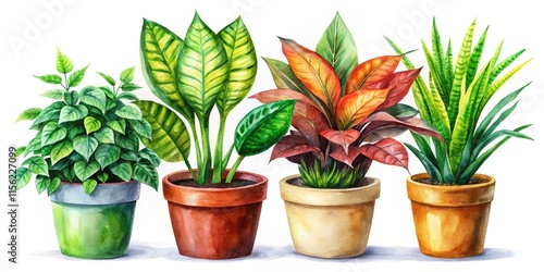 potted plants, isolated, white background, still life, decorative, design, poster, decor, home decor, living room, bedchamber, office, drawing, painting, illustration, digital artwork, nature, green, brown, yellow, purple, pink, orange, red, blue, foliage, leaf, stem, flower, vase, pot, art, beautiful, realistic, high-quality, fine art, modern, contemporary, elegant, artistic, print