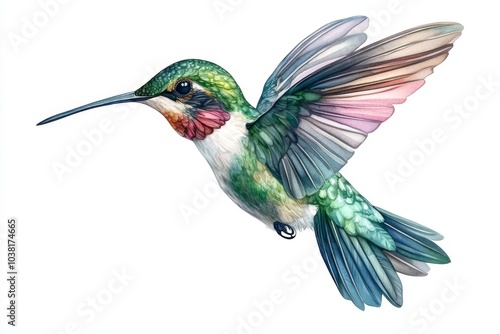 watercolor, hummingbird, flight, isolated, white, background, delicate, colourful, illustration, painting, bird, wing, feather, tropical, elegant, element, logotype, graphic, wildlife, symbol, decoration, exotic, flying, beautiful, design