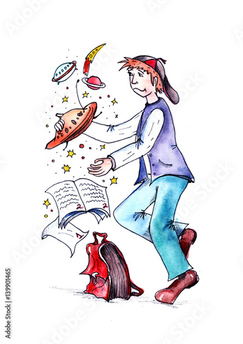 children, boy, playing, watercolor, illustration, spaceship, bad, evaluation, school, diary, apprentice, bully, picture, postcard, student, cap, toy, game, notebook, walk, space, ship, art, sticker, children, sorrowful, frustration, book, paper, runs, stretches, dart, briefcase, bag, walk, human