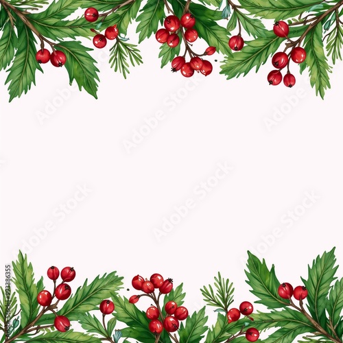 watercolor, illustration, christmas, holiday, garland, red berry, greeting card, invitation, winter scene, isolation, white background, cheerful, heartwarming, holiday greeting, merry christmas, happy holiday, winter landscape