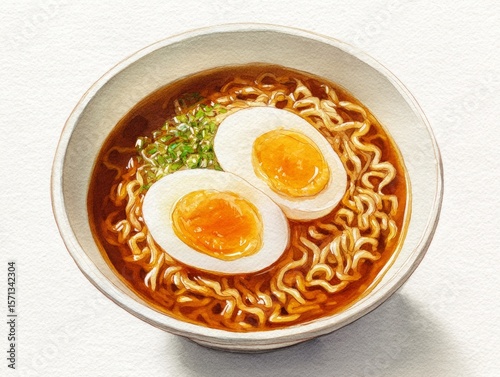 Watercolor illustration of a steaming ramen noodle soup bowl topped with soft boiled egg and rich umber broth on clean white background