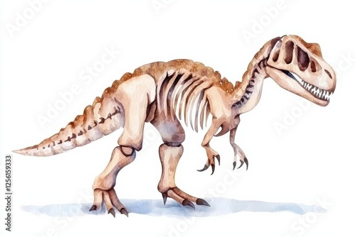 Watercolor illustration of a tyrannosaurus rex skeleton museum exhibit art display educational environment side view, isolated on white background
