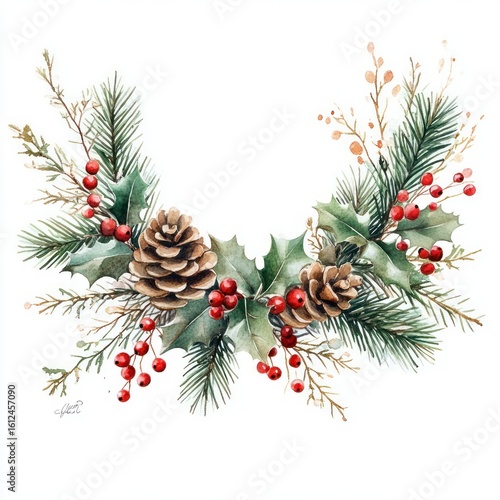 Watercolor illustration of festive winter garland featuring pinecones, green pine branches, holly leaves, and red berries conveying holiday cheer