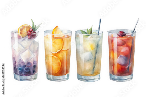 Watercolor illustration of four refreshing tall glasses filled with colorful iced cocktails garnished with fruit and herbs against a dark backdrop transparent background