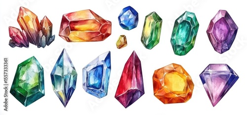 watercolor, gem, crystal, gem, colourful, rainbow, brilliant, transparent, mineral, precious, diamond, ruby, quartz, amethyst, topaz, garnet, crystal, illustration, hand-drawn, digital, art, design, collection, set, elegant, natural, sparkling, geometric, shape, facet, polished, precious stone, jewellery, decorative, many-coloured