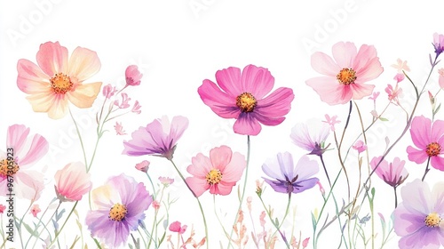cosmos, garden, watercolor, pink, field, background, autumn, landscape, frame, vector, isolated, nature, floral, beauty, white background, leaf, plant, environment, beautiful, hand-drawn, decoration, flora, blooming, pink flower, korea, korean, seoul, japan, japanese, bloom, decoration, flower, summer, illustration, leaf, white, colours, natural, botany, bouquet, flower petals