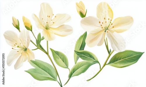 Watercolor illustration spring blossom flowers with light yellow and soft pink petals green leaves isolated on white background