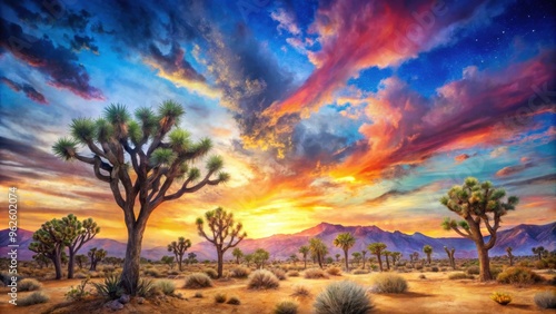 Watercolor painting of Joshua Tree National Park under a colorful sky , watercolor, painting,Joshua Tree, National Park, nature