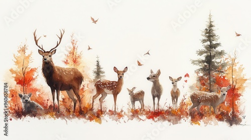 watercolor, painting, timberland, animal, white, background, illustration, tree, animal, nature, forest, christmas, outdoors, vector, wood, cervid, antler, reindeer, stag, mammal, vertical, artiodactyla, cervid, timberland, cold, day, landscape, season, winter, blue, silhouette, wild, wildlife, cartoon, elk, art, design, brown, horn, head, cute, antler