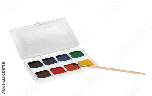 Watercolor paints in a case, isolated, on a white background with a brush