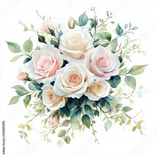 Watercolor Roses Floral Bouquet on White, Elegant Wedding Design