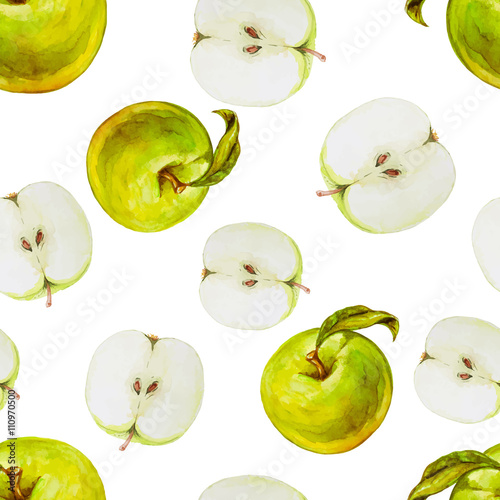 Watercolor seamless pattern with green apples. Hand drawn design. Vector summer fruit illustration.