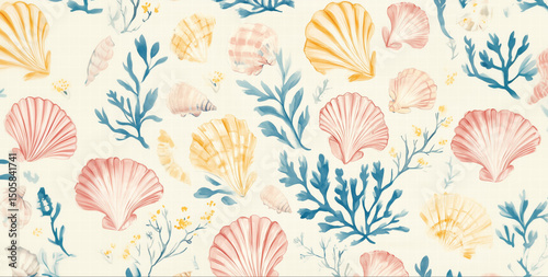 Watercolor seashells and seaweed creating a beautiful seamless pattern