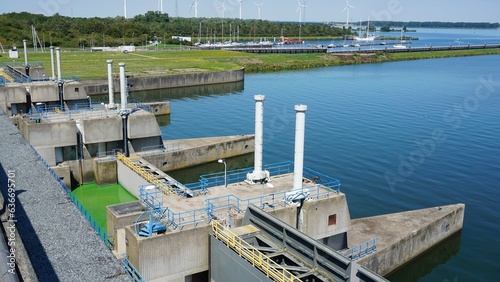 Waterworks at Haringvliet lock in the Netherlands. Delta works that separate water from salt to fresh and influence the tides of high and low water. Concrete construction.
