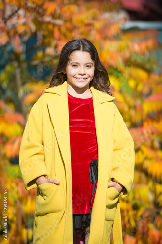 Weather forecast. Happy little child outdoors nature background. Autumn warm weather. October to do list. Upcoming events. Autumn beauty. Girl smiling face walking in park. Trendy girl in autumn coat