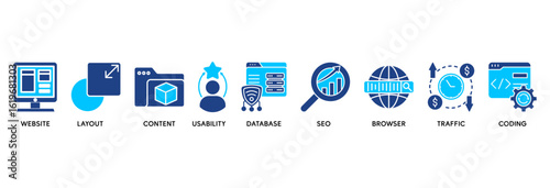 Web design icon set vector illustration concept relate to website, layout, content, usability, database, seo, browser, traffic and coding