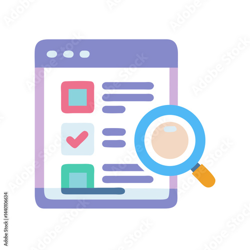 website, checklist, magnifying glass, search, optimization, list, checkmark, form, completed, analysis, research, inspection, online, digital, technology, computer, cyberspace, business, datum, design, illustration, graphic, icon, vector, symbol, signs, element, flat, marketing, strategy, search engine, inspecting, compliance, process, progress, evaluation, planning, development