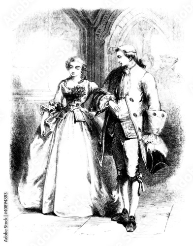 wedding, marriage, couple, portrait, love, sacrament, ceremony, man, woman, spouse, bride, religon, 18, ancient, elder, vintage, century, engraving, illustration, scene, fashion, clothes, clothes, dress, bourgeois, bourgeoisie, loftiness, nobleman, aristocrat, aristocracy, drawing