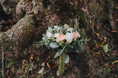 wedding bouquet of flowers and greens stands in forest near large old tree