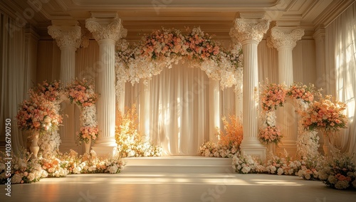 wedding, ceremony, venue, floral, decor, flower, column, arch, white, pink, peach, romantic, elegant, classic, grand, luxury, beautiful, event, design, style, interior, architecture, decoration, reception, altar, bouquet, arrangement, celebration, love, happy, special, occasion, inspiration, dream, fairy tale, bride, groom, marriage