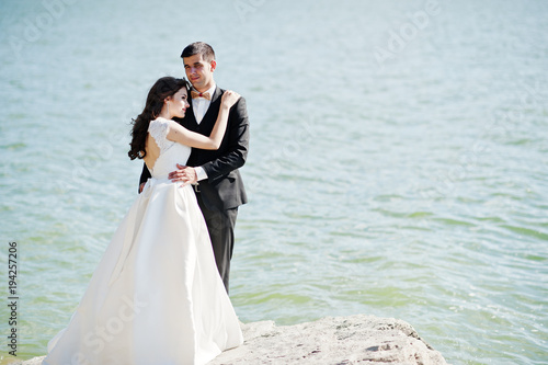 Wedding couple at breathtaking landscape with rock and lake.