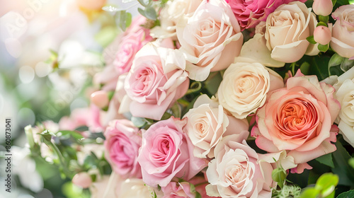 Wedding flowers detailed bridal bouquet Decor made of roses peonies and decorative plants closeup selective focus nobody objects : Generative AI
