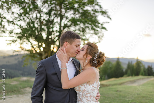 Wedding photography in the mountains. The newlyweds kiss. Close-up.