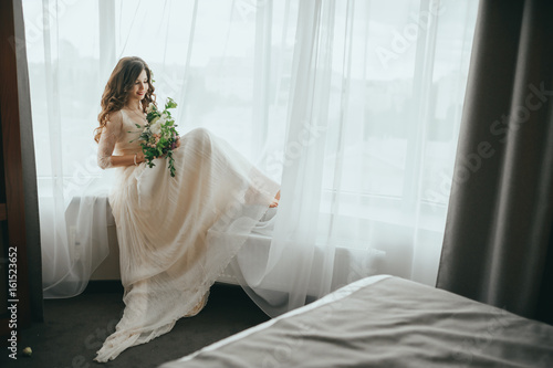 Wedding preparation. Beautiful young bride in white wedding dress indoors