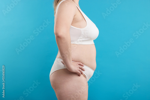 Weight loss. Plus size woman in underwear on light blue background, closeup
