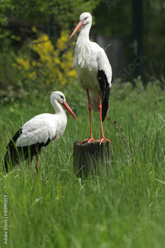 stork, 2, wildlife, couple, vogel, animal, meadow, big, green, grass, nature, red, black, standing, white, stork