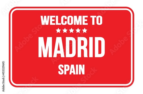WELCOME TO MADRID - SPAIN, words written on red street sign stamp