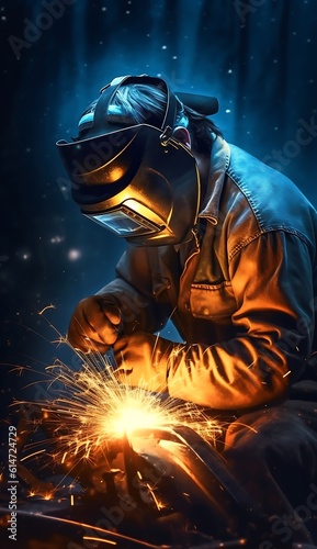 welder in protective clothing welding metal with sparks on dark blue background ai generated