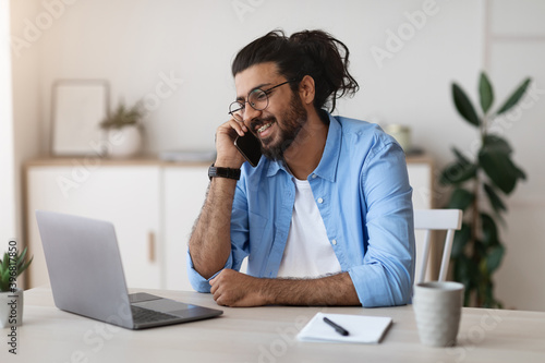 man, talking, mobile phone, phone, call, laptop, home, office, communication, business, freelancer, modern, background, technology, western, people, person, job, workplace, consulting, client, career, smiling, indian, employee, goggles, young, male, lifestyle, entrepreneur, client, indoor, work, businessman, marketing, mobile, manager, looking, successful, photogenic, men at work, free space, project, discussing, freelance, remote, casual attire
