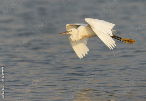 Western reef heron white morphed flying at mameer coast, Bahrain
