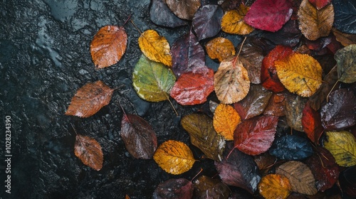 wet, autumn, leaf, scattered, dark, pavement, ground, fallen, colours, yellow, orange, red, brown, green, nature, season, fall, foliage, vibrant, colourful, texture, pattern, organic, natural, decay, beauty, abstract, background, design, art, photo, still life, moody, atmospheric
