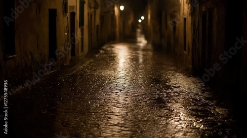 Wet cobblestone alley at night, Europe, rain reflecting light
